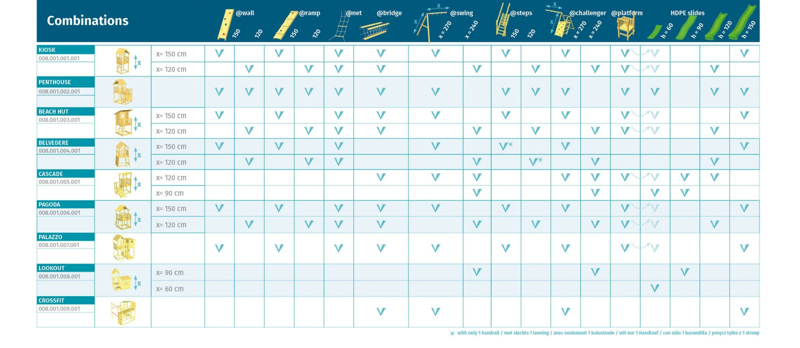 Most play tower models give you a choice of platform height: 1.2 m or 1.5 m in most towers and 60-90/90-120cm on the Cascade.