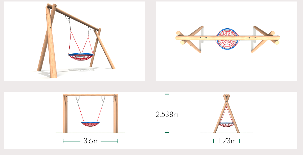 Commercial round timber swing set with nest swing in Radiata pine